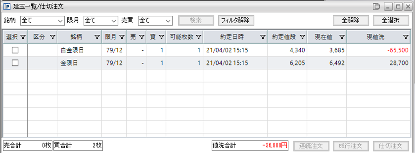 片張り金限日買い1枚と片張り白金限日買い1枚の含み損は 36,800 円になります。
