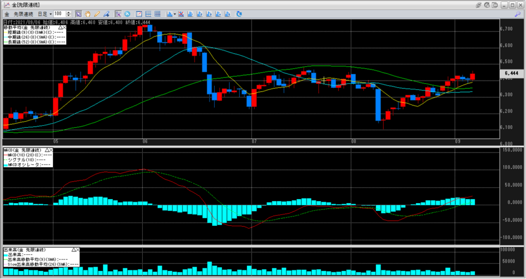 金価格は、5:30時点での終値は6,444円で