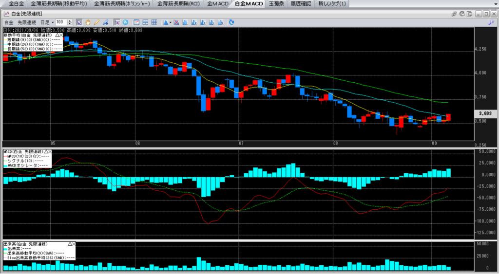 2021年9月3日8:45~9月4日5:30 金白金鞘値動きのチャートを張り付けています。