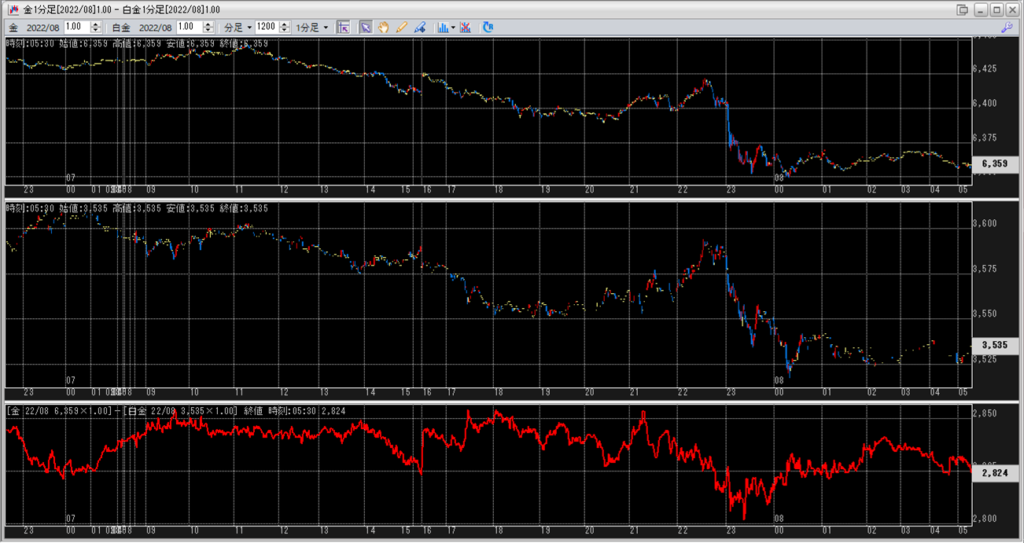 下:金白金鞘(金白金の価格差 = 金1グラムの価格 - 白金1グラムの価格)