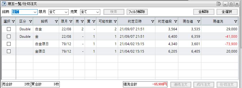 片張り金限日買い1枚と片張り白金限日買い1枚の含み損は 53,900 円になります。