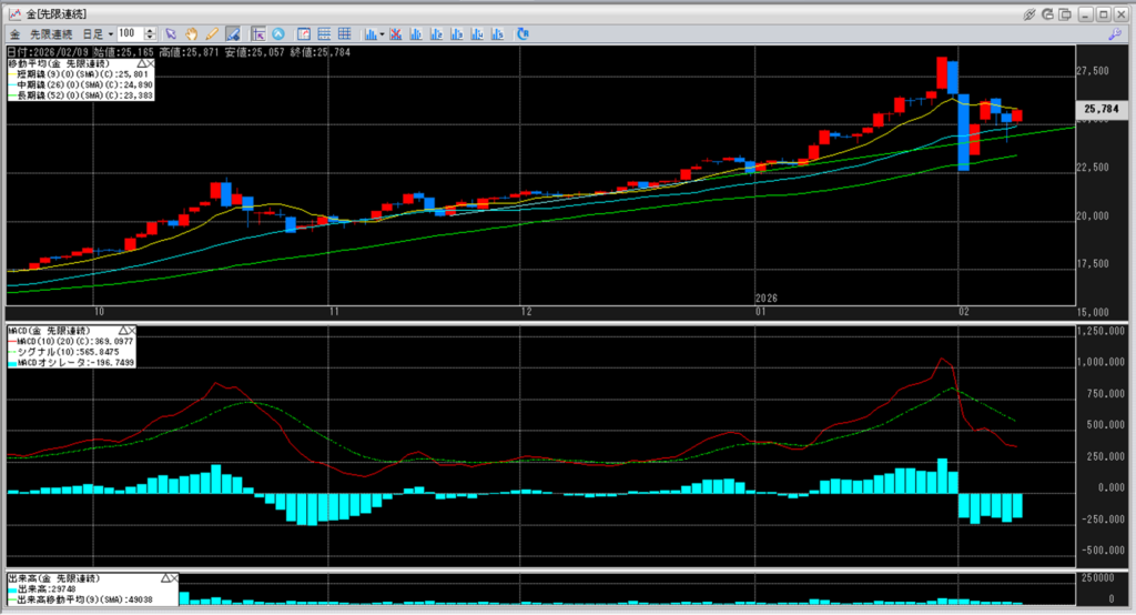 移動平均線の一番上に位置している短期線25,801円を割り込んで、