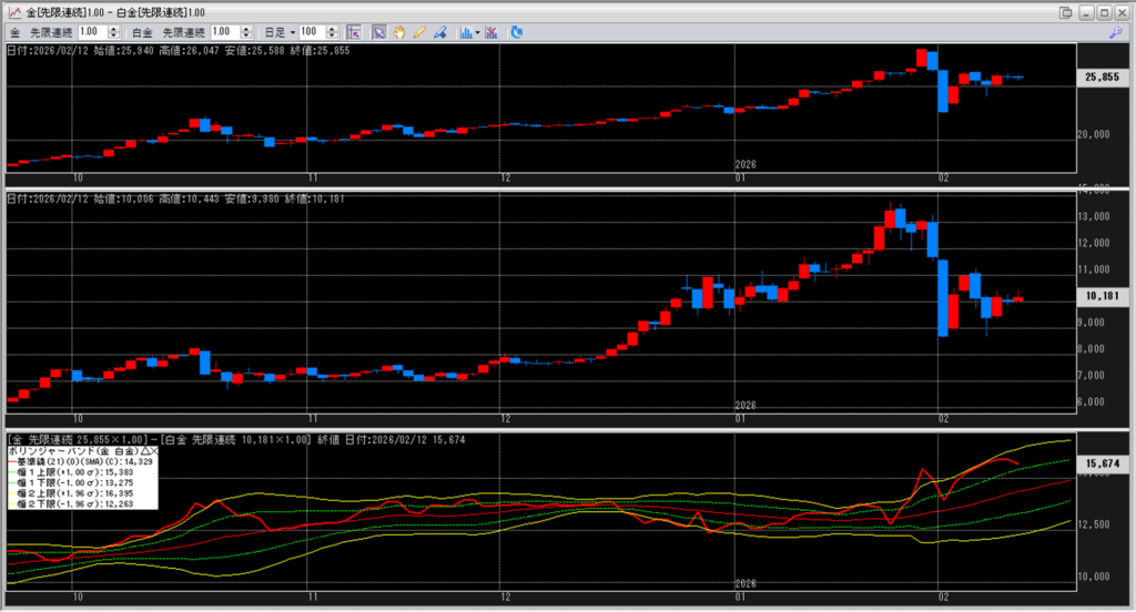金白金の鞘をボリンジャーバンドで見ていきます。