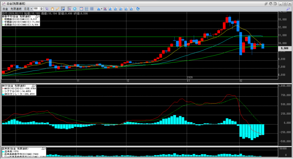 白金のチャートを見ると、約11,000円を割り込み続けています。