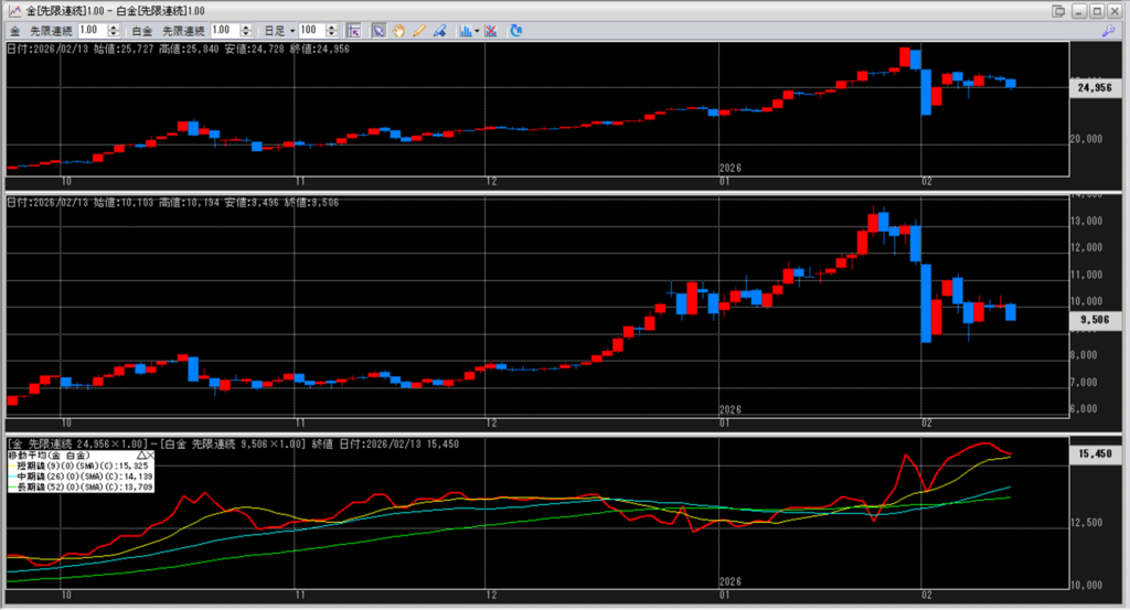 下記に金白金鞘の移動平均線のチャートを貼り付けています。