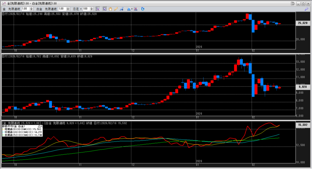下記に金白金鞘の移動平均線のチャートを貼り付けています。
