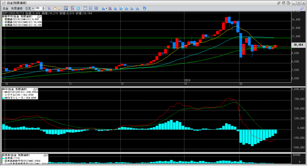 白金のチャートを見ると、約11,000円を割り込み続けています。