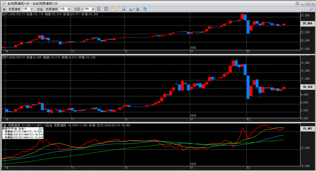 ですが、金白金鞘が短期線を割り込み続けています。