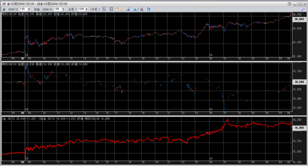 下:金白金鞘(金白金の価格差 = 金1グラムの価格 - 白金1グラムの価格)