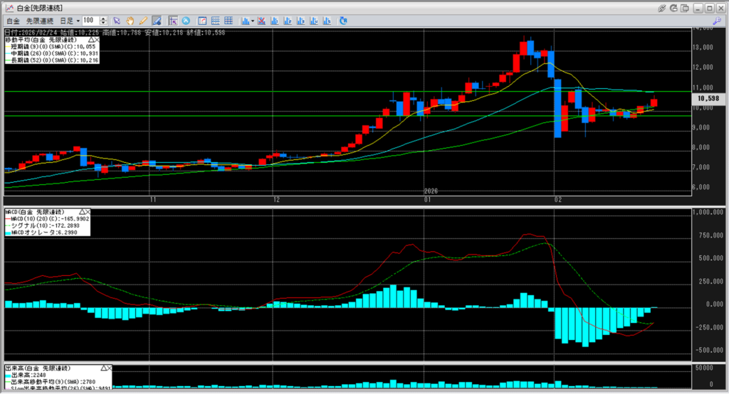 白金単体で見ると、2/20 15:45比で+349円となっております。