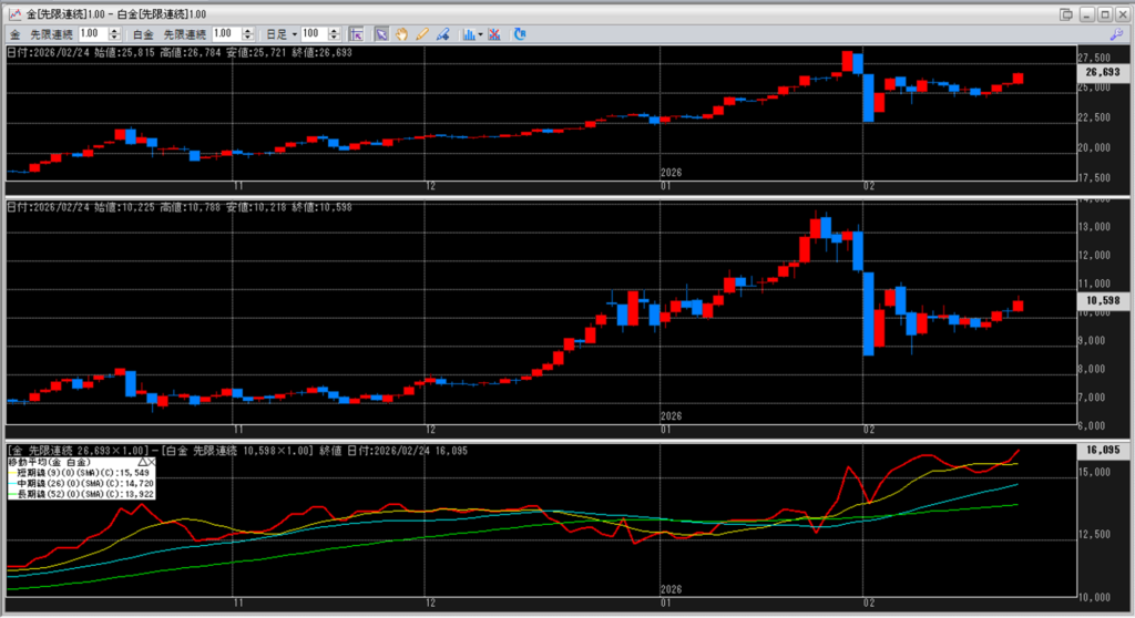 下記に金白金鞘の移動平均線のチャートを貼り付けています。