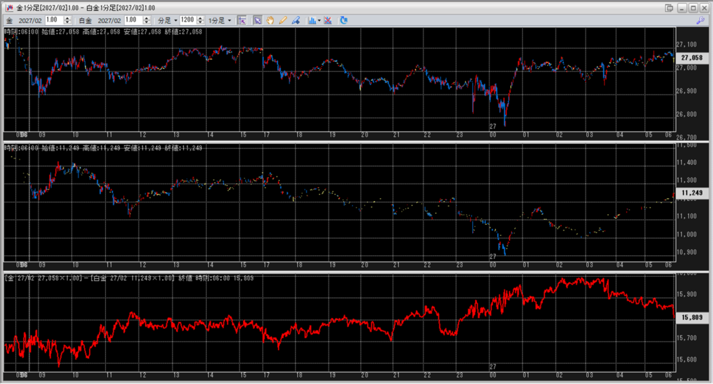 下:金白金鞘(金白金の価格差 = 金1グラムの価格 - 白金1グラムの価格)