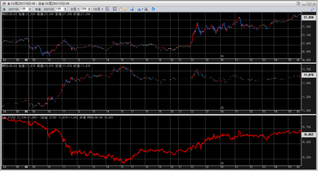 下:金白金鞘(金白金の価格差 = 金1グラムの価格 - 白金1グラムの価格)
