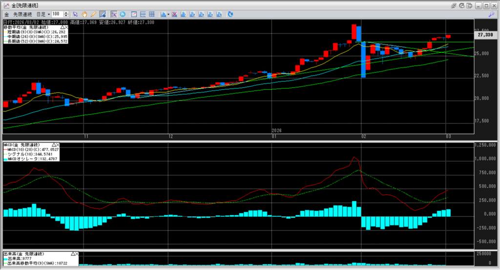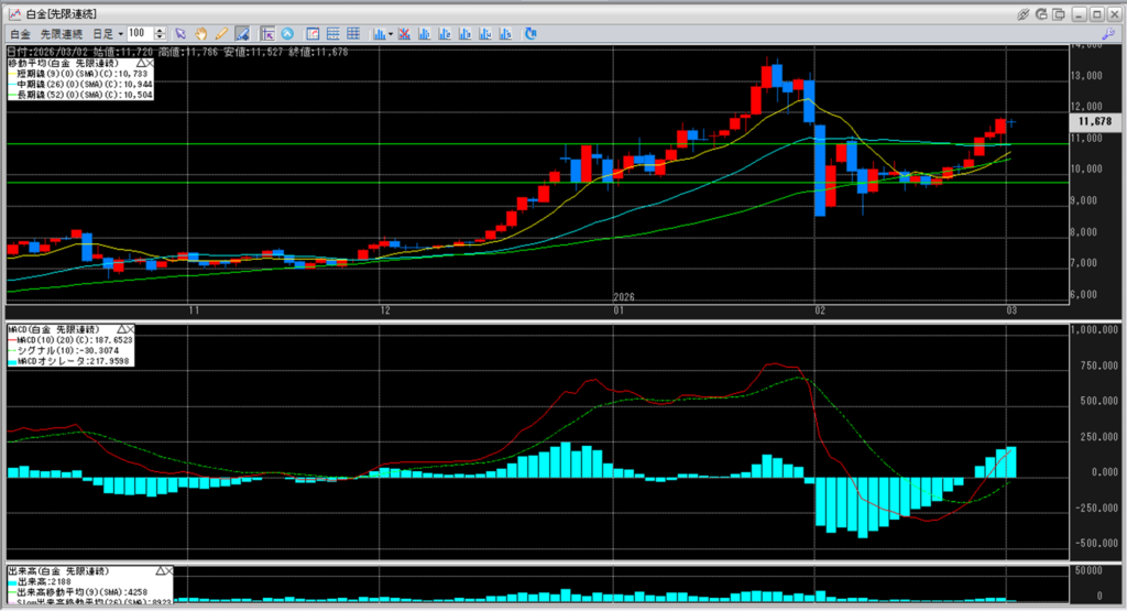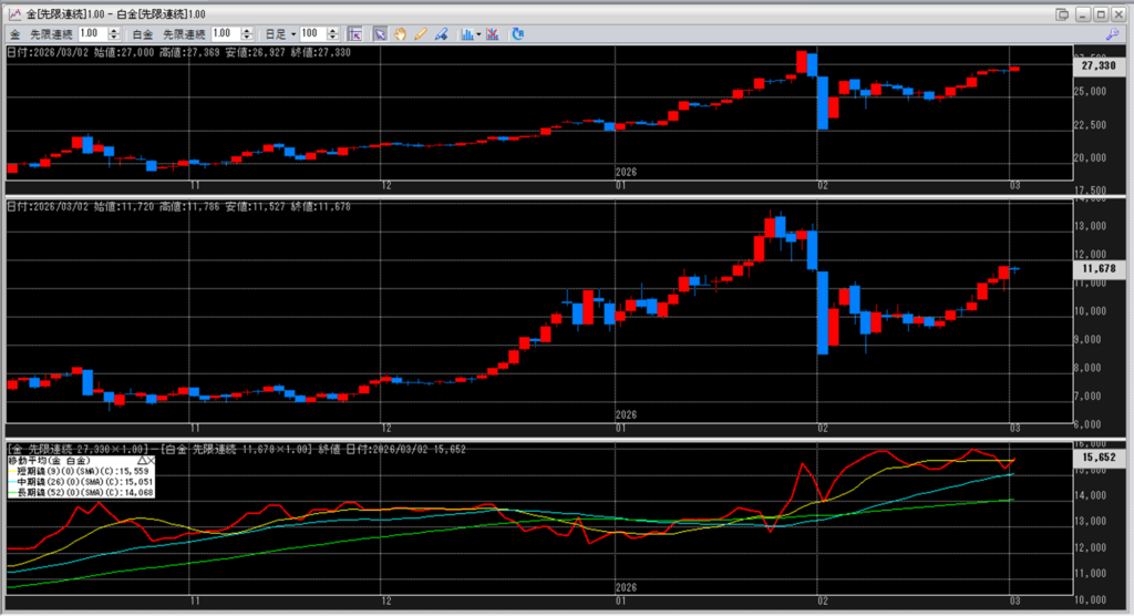 下記に金白金鞘の移動平均線のチャートを貼り付けています。