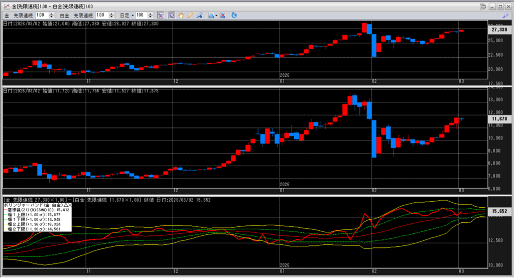 金白金の鞘をボリンジャーバンドで見ていきます。