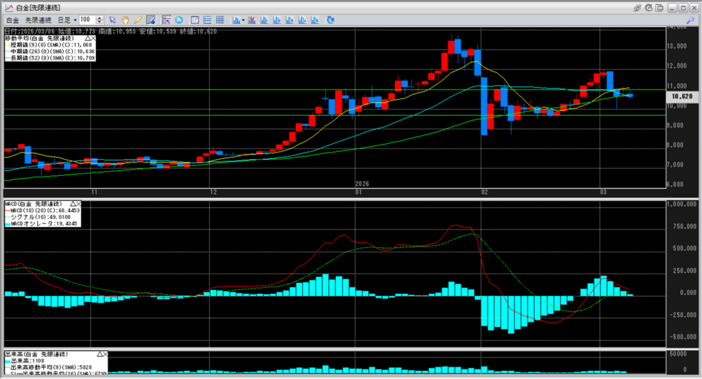 白金の値段は、6:00の終値で10,620円となっており、
