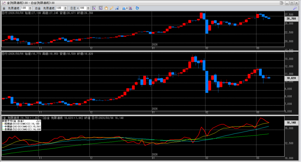 下記に金白金鞘の移動平均線のチャートを貼り付けています。