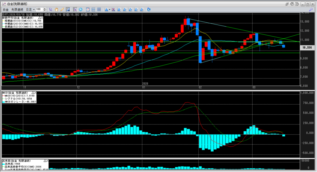白金のチャートを見ると、11,000円を割り込み続けています。