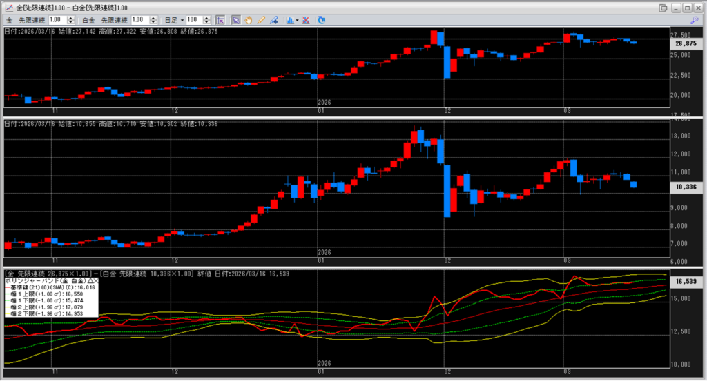 その+1σに沿って、金白金鞘の値動きはついていっています。