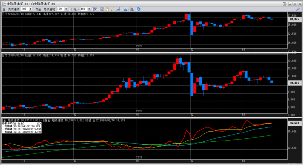 下記に金白金鞘の移動平均線のチャートを貼り付けています。