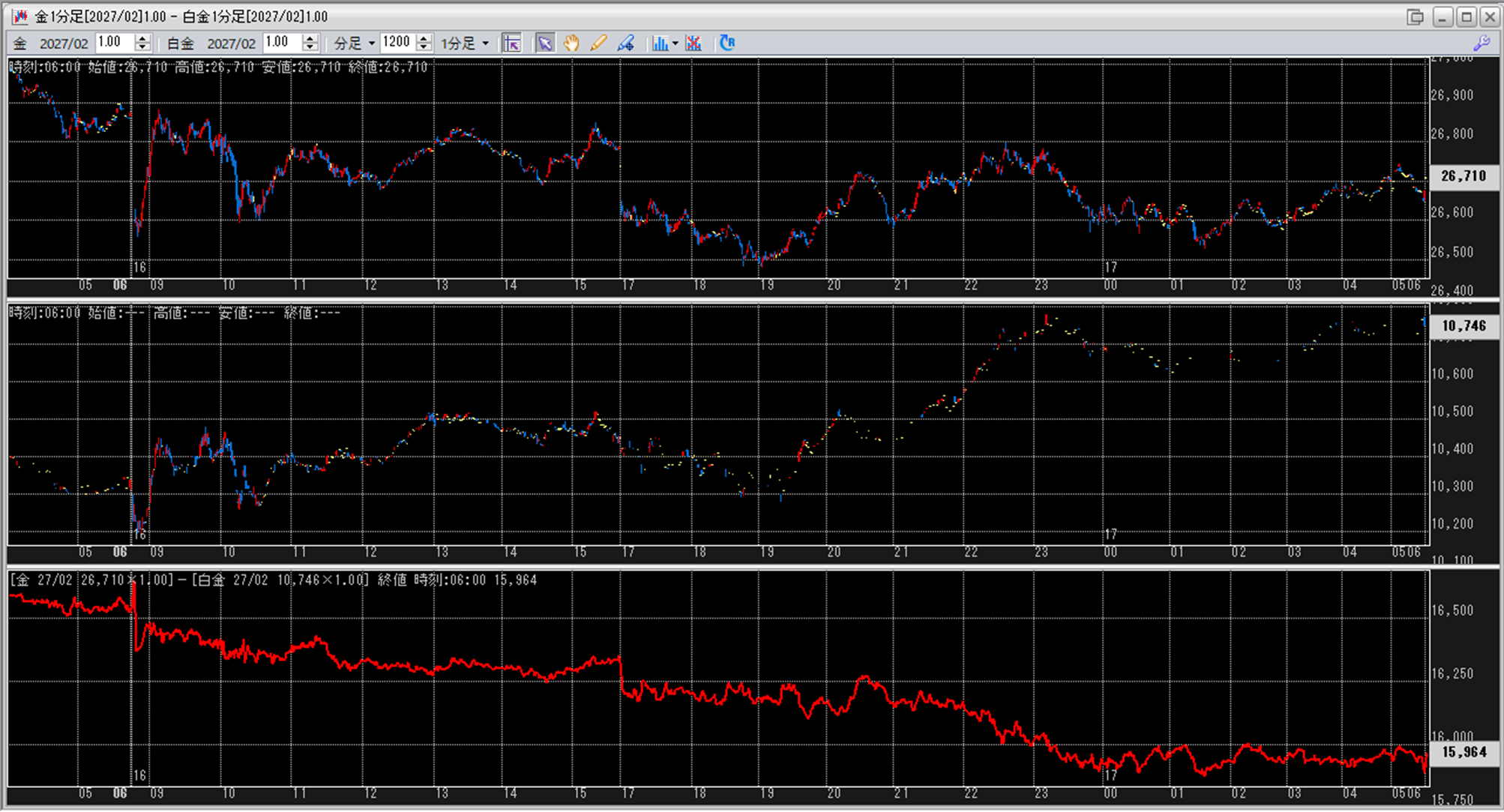 下:金白金鞘(金白金の価格差 = 金1グラムの価格 - 白金1グラムの価格)