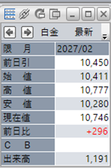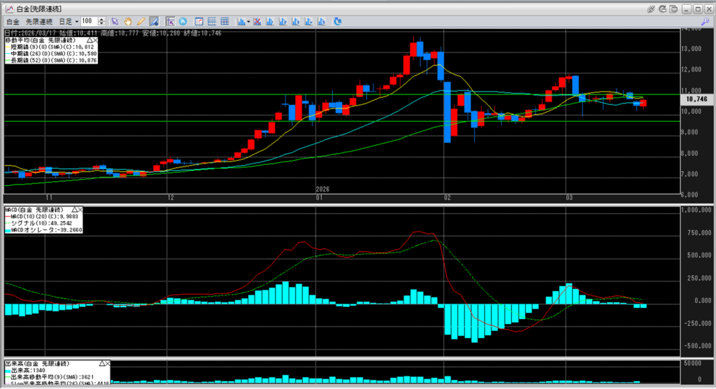 白金のチャートを見ると、11,000円を割り込み続けています。