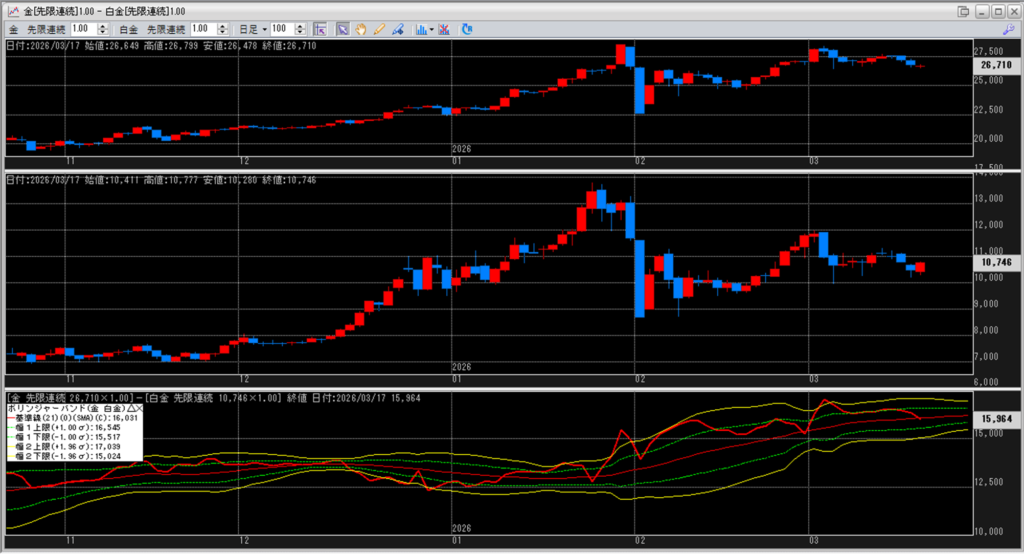 金白金の鞘をボリンジャーバンドで見ていきます。