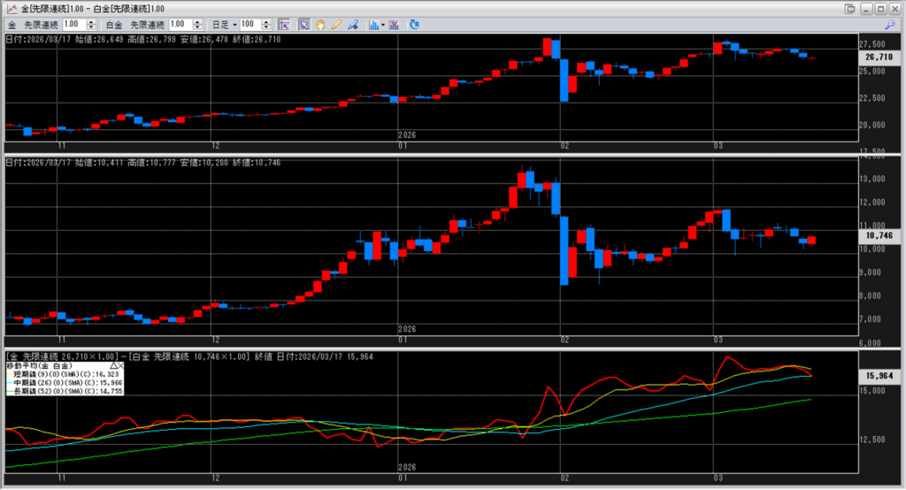 下記に金白金鞘の移動平均線のチャートを貼り付けています。