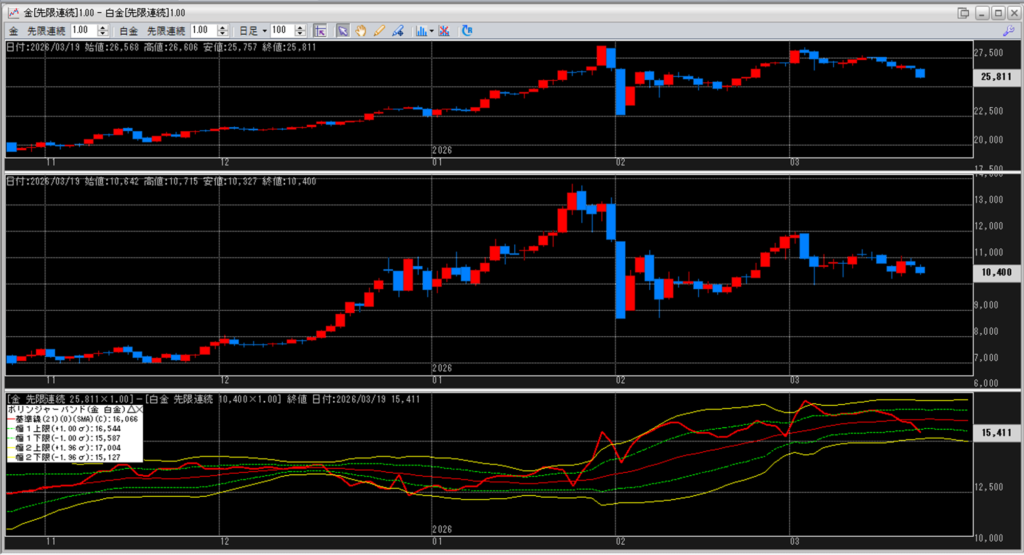 金白金の鞘をボリンジャーバンドで見ていきます。