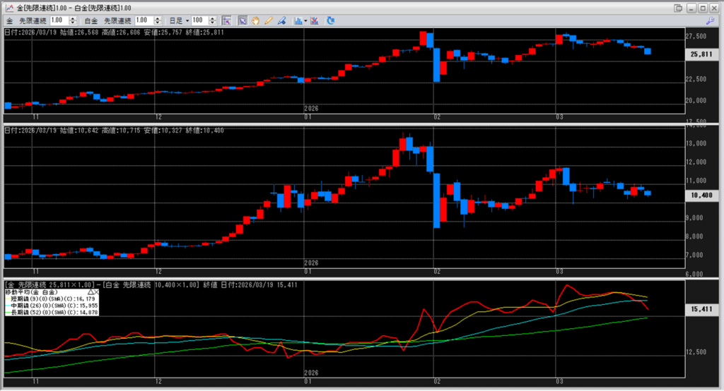 下記に金白金鞘の移動平均線のチャートを貼り付けています。