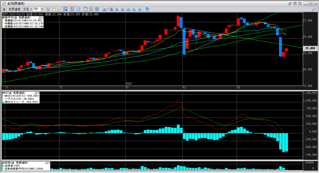 移動平均線の一番下に位置している短期線25,450円を割り込んで、