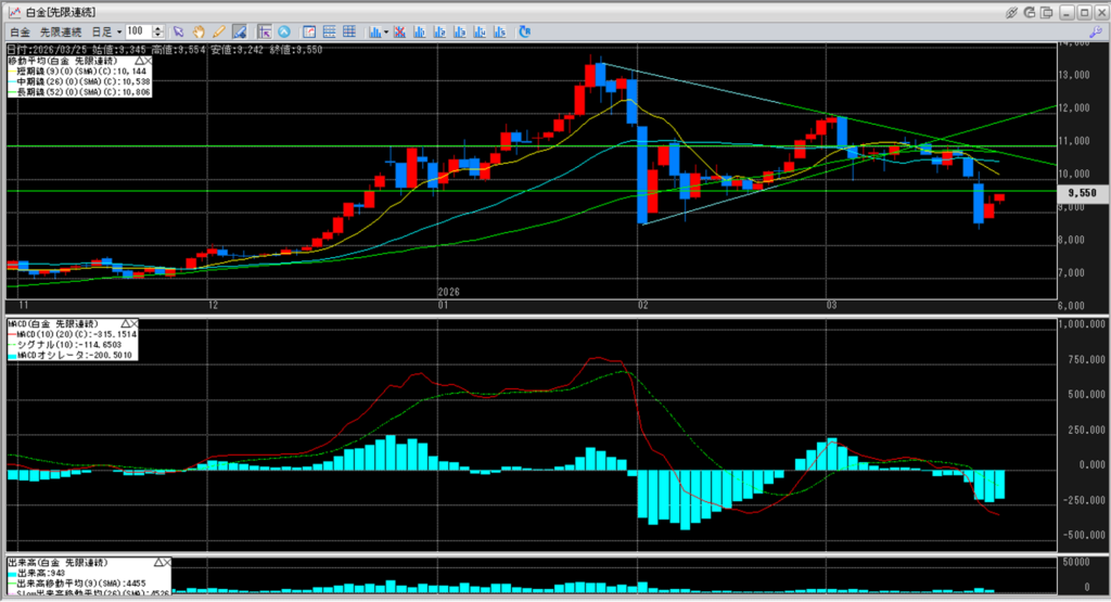 白金のチャートを見ると、11,000円を割り込み続けています。