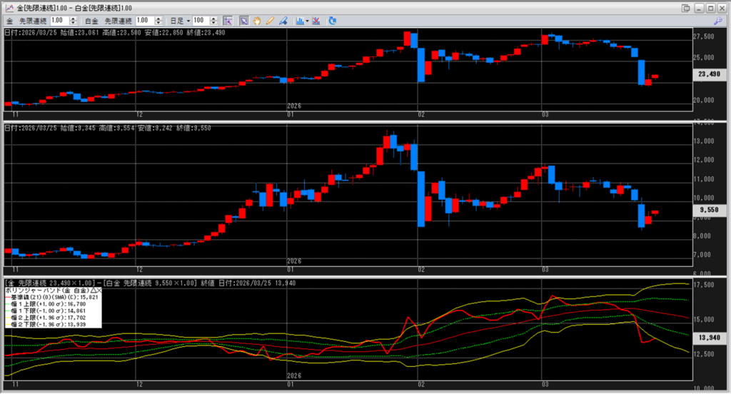 金白金の鞘をボリンジャーバンドで見ていきます。