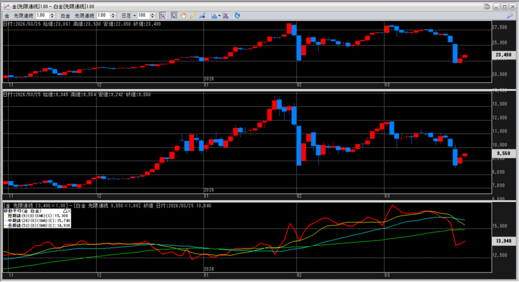 下記に金白金鞘の移動平均線のチャートを貼り付けています。