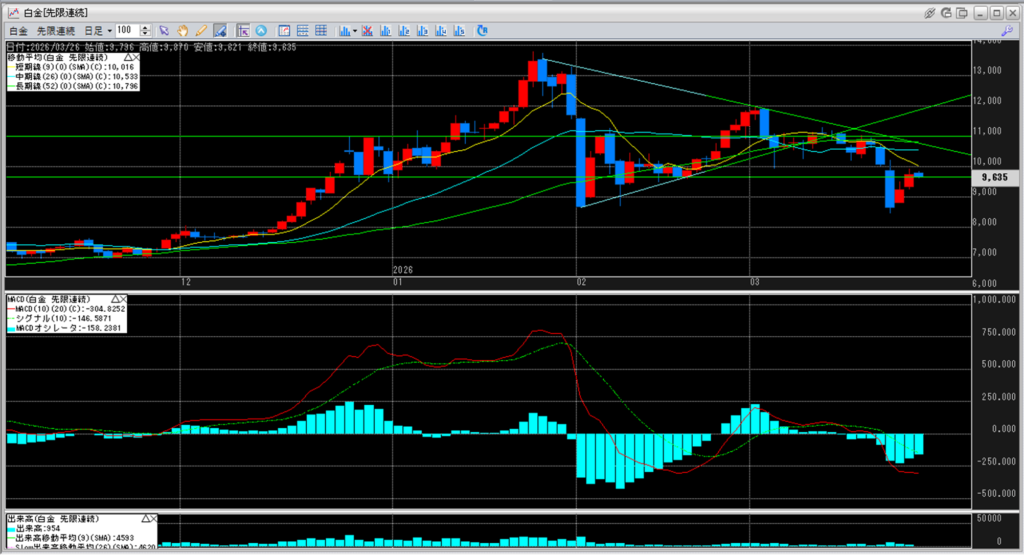 白金のチャートを見ると、11,000円を割り込み続けています。