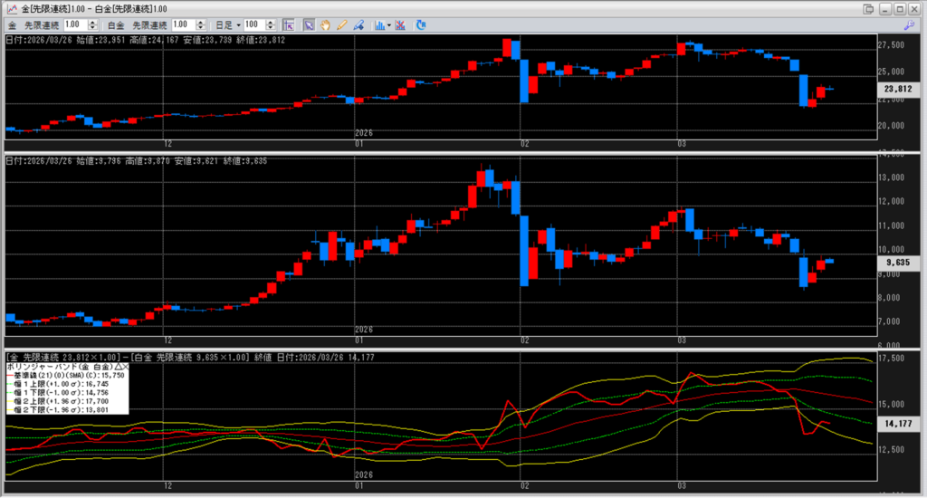 金白金の鞘をボリンジャーバンドで見ていきます。