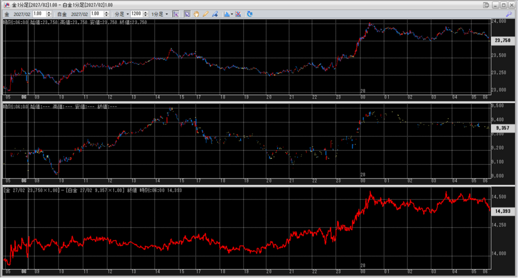 下:金白金鞘(金白金の価格差 = 金1グラムの価格 - 白金1グラムの価格)