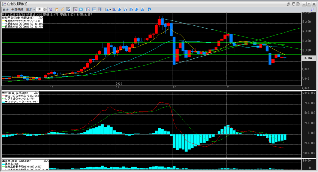 白金のチャートを見ると、11,000円を割り込み続けています。