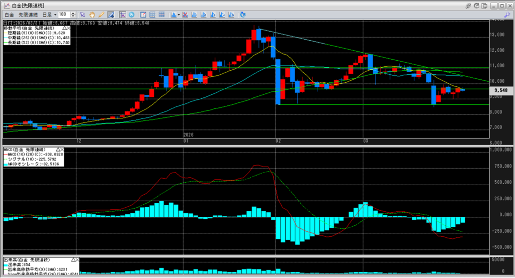 白金のチャートを見ると、11,000円を割り込み続けています。