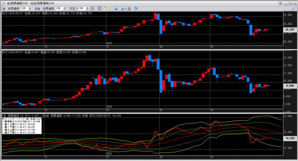 金白金の鞘をボリンジャーバンドで見ていきます。