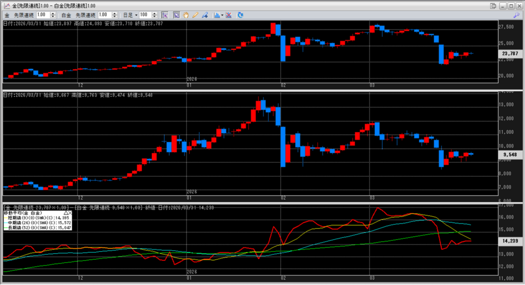 下記に金白金鞘の移動平均線のチャートを貼り付けています。
