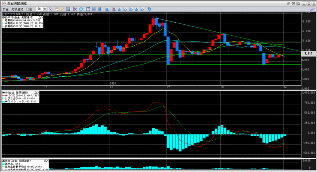 白金のチャートを見ると、11,000円を割り込み続けています。