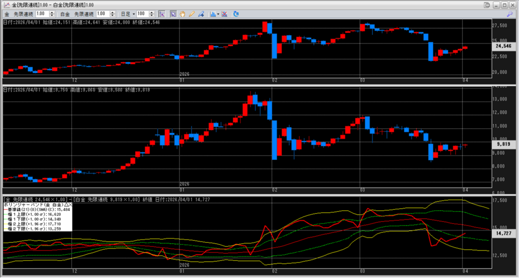 金白金の鞘をボリンジャーバンドで見ていきます。