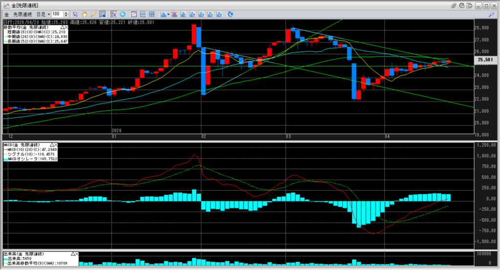 移動平均線の真ん中に位置している短期線25,210円を超えて、