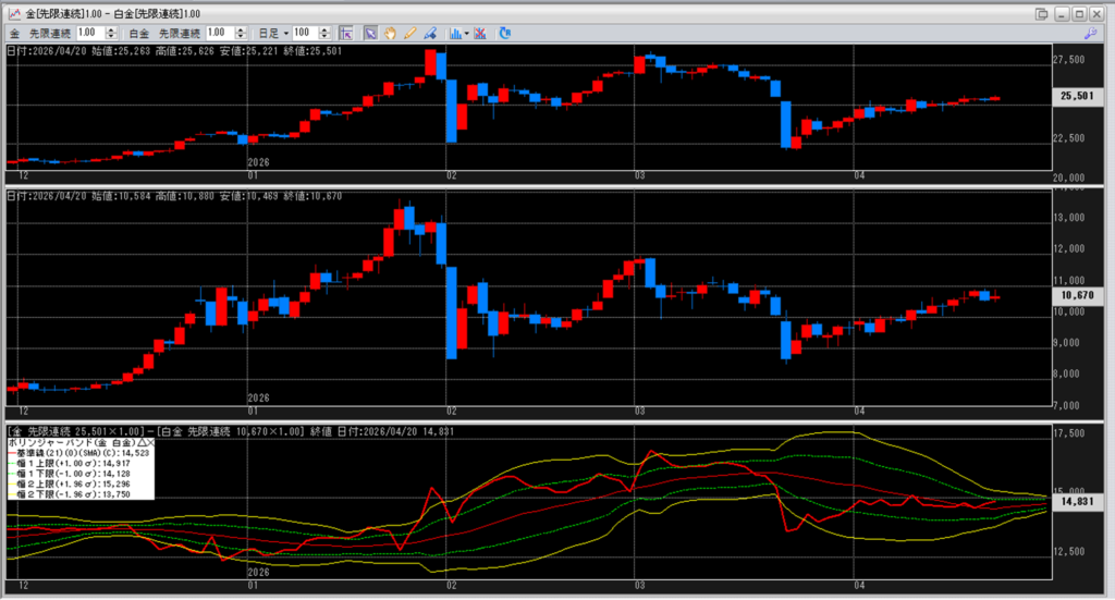 金白金の鞘をボリンジャーバンドで見ていきます。