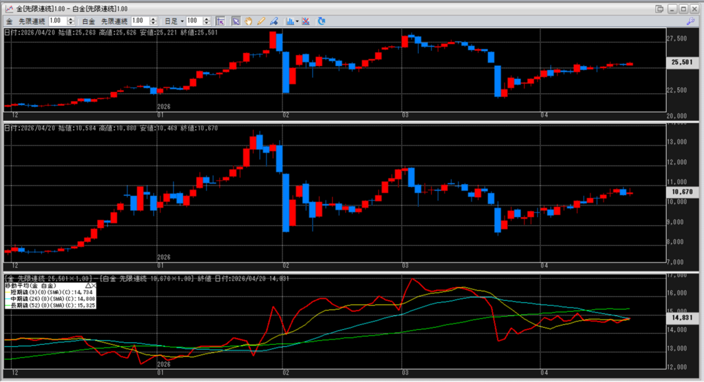 下記に金白金鞘の移動平均線のチャートを貼り付けています。