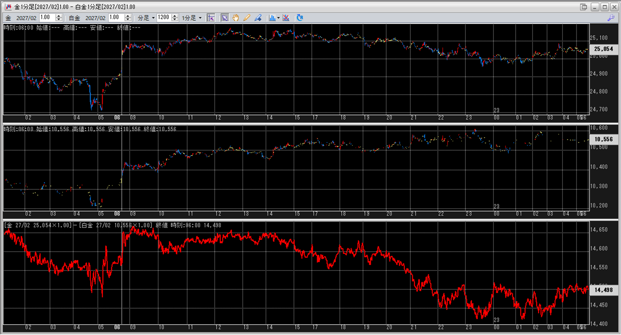 下:金白金鞘(金白金の価格差 = 金1グラムの価格 - 白金1グラムの価格)