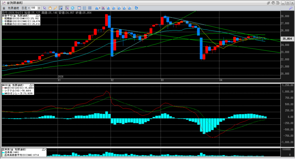 移動平均線の真ん中に位置している短期線25,192円を割り込んで、