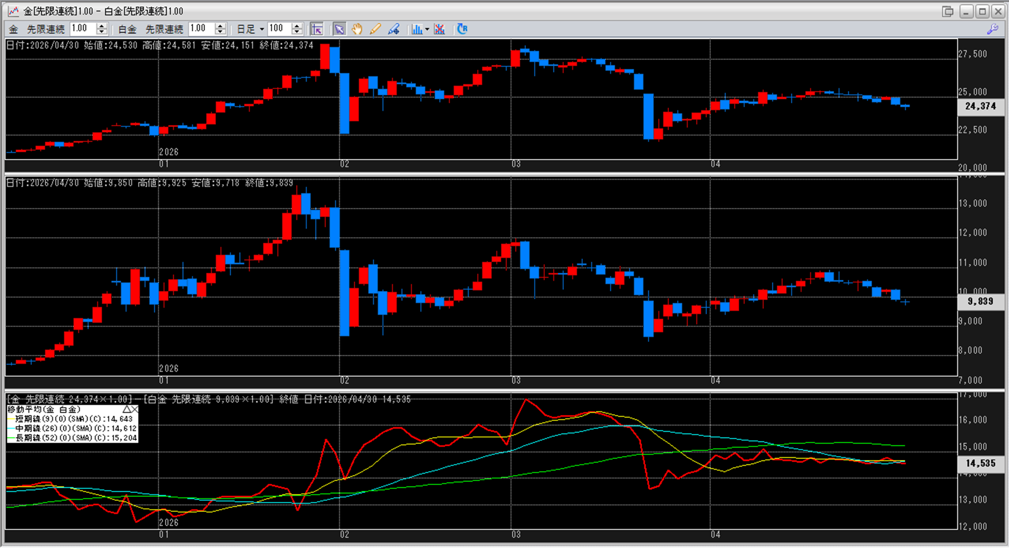 下記に金白金鞘の移動平均線のチャートを貼り付けています。