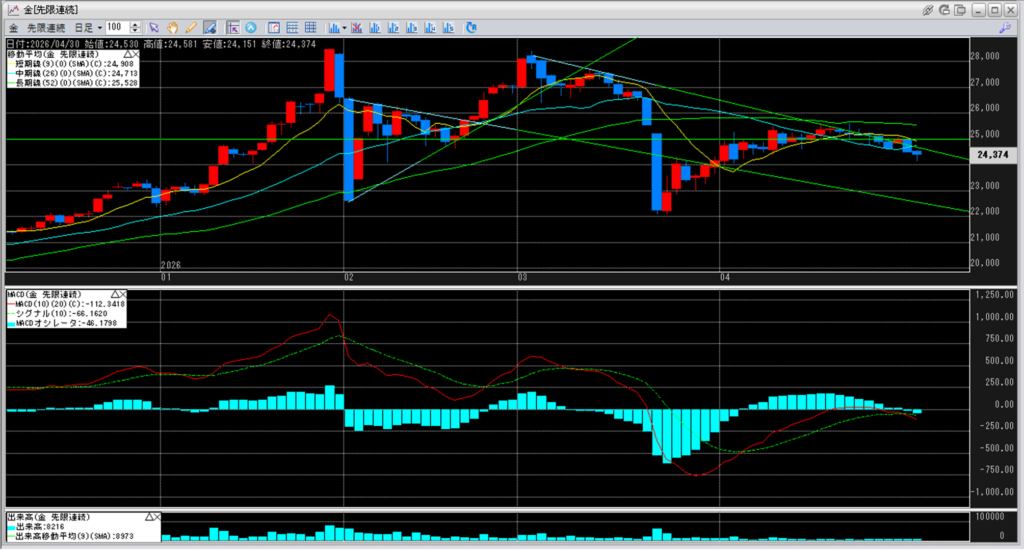 移動平均線の一番下に位置している中期線24,713円を割り込んで、